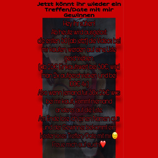 ViiiiideoooosSüße Rabattaktion! 6 Videos → nur 60 € 12 Videos → nur 100 € Einzelvideos → nur 25 € Wunschvideos gibt es natürlich ebenfalls mit Rabatt! Alles nur für euch greift zu, solange es geht! Aktion endet mo